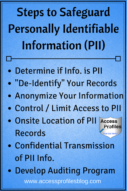 But the absolute best way to safeguard PII begins with controlling or limiting access to PII. This includes both physical and mobile access including cell phones, laptops, etc.. Curbing the number of people who come in contact with sensitive PII information is the easiest way to keep it safer and control how it is handled.